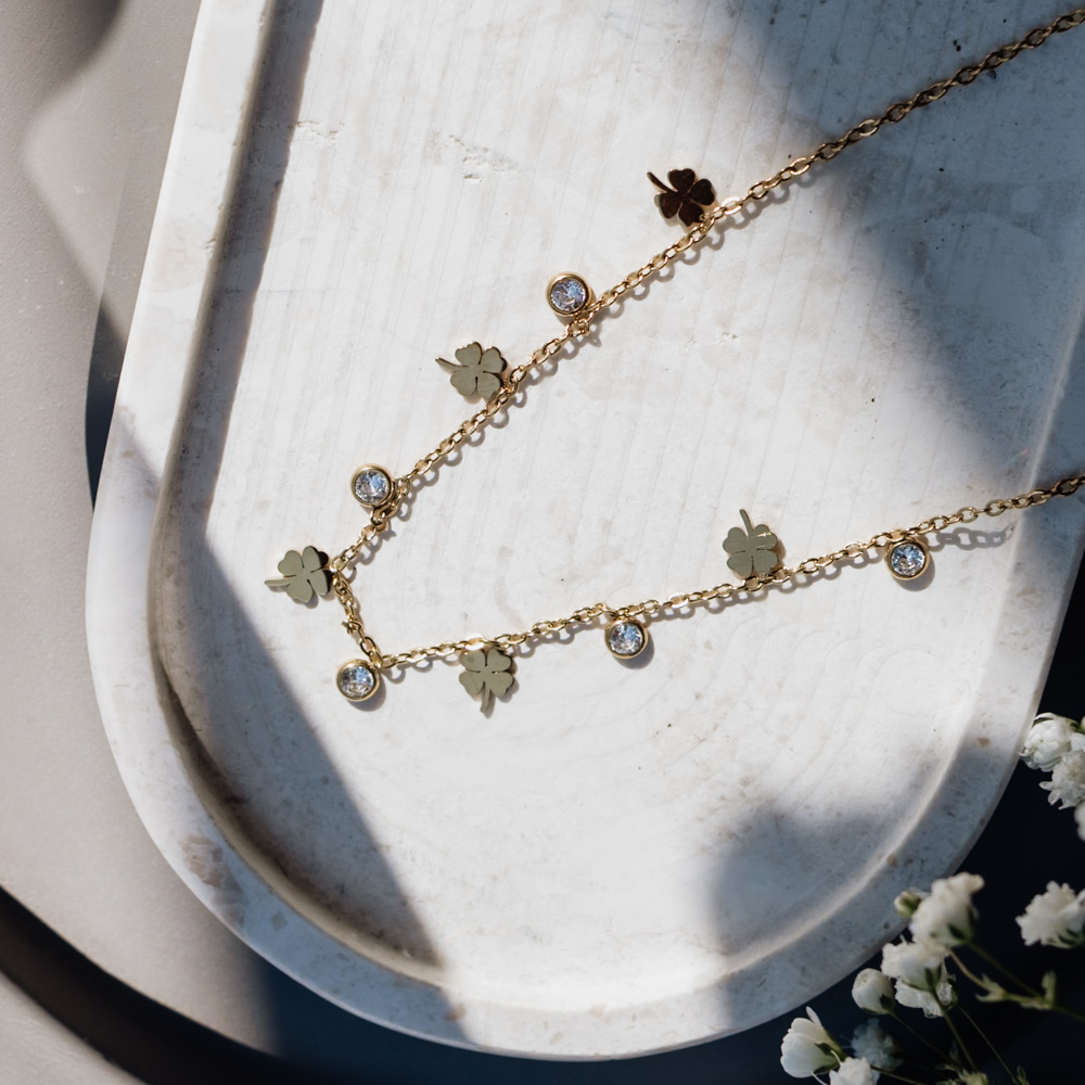 Ατσάλινη χρυσή αλυσίδα για το λαιμό με στρας και τριφυλλάκια